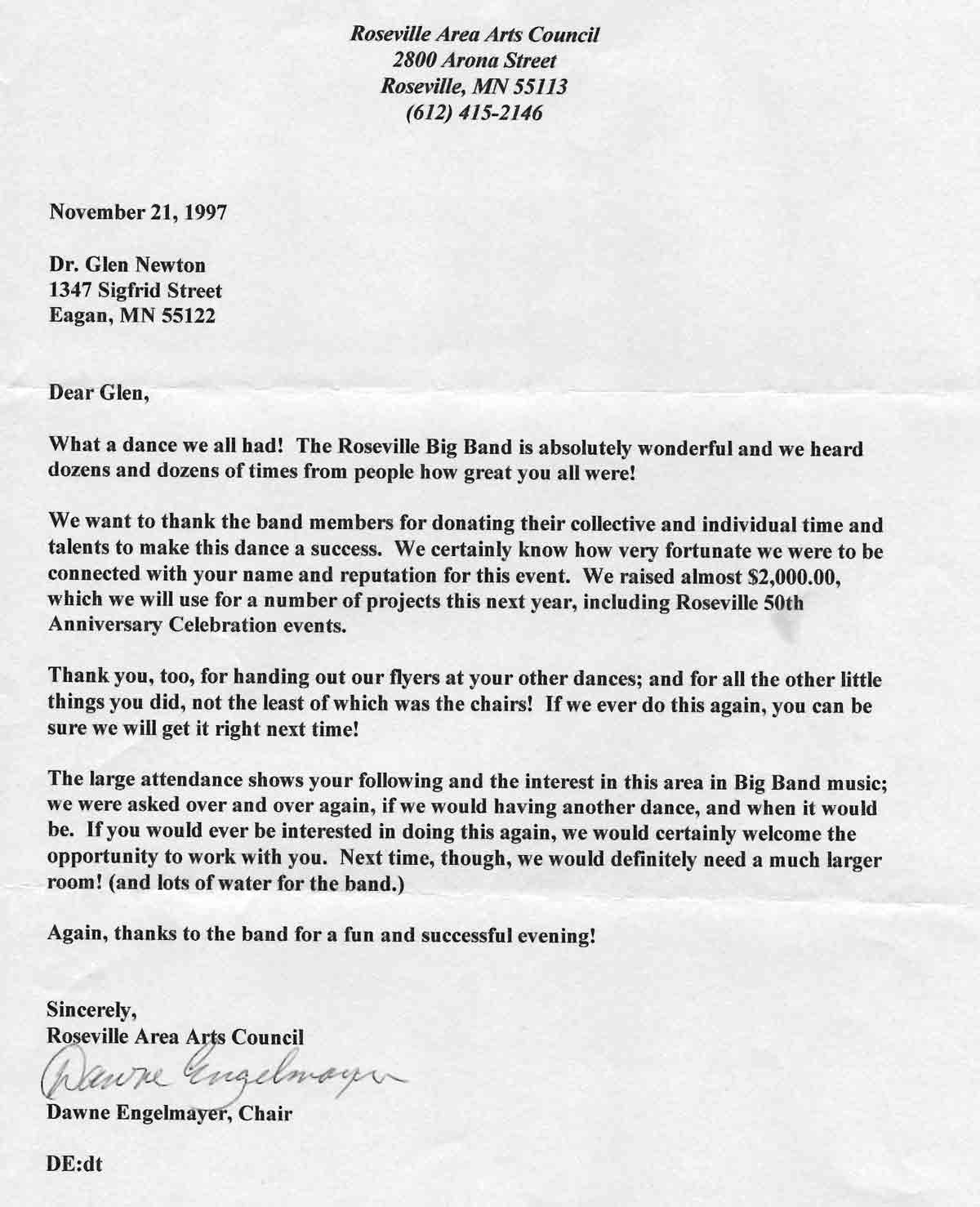 Letter of Thanks from the Roseville Area Arts Council: